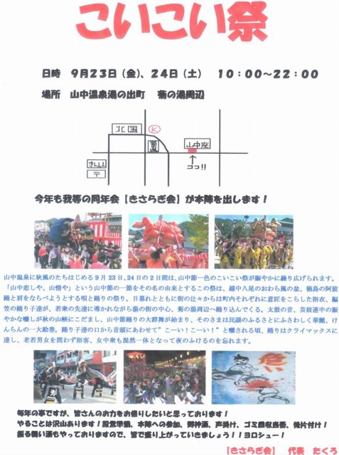 今年もやってまいりました♪ 山中温泉のお祭り【こいこい祭】 我等が【きさらぎ会】も毎年の場所に本陣を出します♪ 今年は閏年の関係で23日(金)&24日(土)の2日間になります! たくろは23日は仕事なので夜から参加、24日は休みなので1日中います♪ 是非是非お越し下さい♪