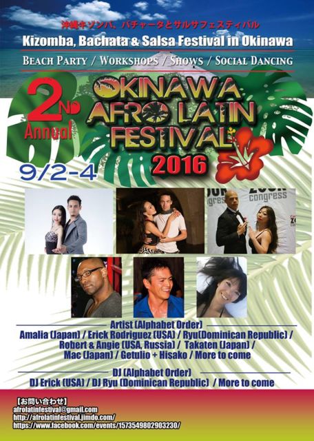 ★日本語・ENGLISH★ ★日本語 沖縄のキゾンバ、バチャータとサルサフェスティバルです。 -ビーチパーティー -ワークショップ -パフォーマンス -ソーシャル ☆アーティスト (アルファベット順) -Anup Thomas (Thailand) -Erick Rodriguez (USA) -Getulio & Hisako (Brazil, NY) -Ryu & Amalia (DR, Japan) -Robert & Angie (USA, Russia) -Takaten (Japan) -Mac (Japan) ☆ワークショップ -Bachata -Kizomba -Rumba -Salsa -Zouk ☆DJ (アルファベット順) -DJ Erick (USA) -DJ Kinjou (Japan) -DJ Ryu (DR)