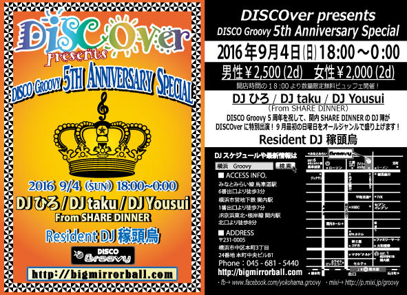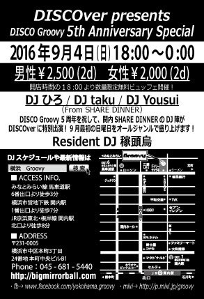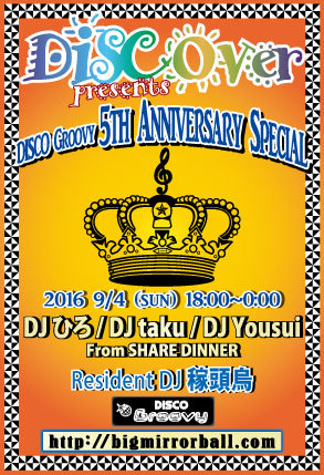 DISCO Groovy ¥Þ¥Í¡¼¥¸¥ã¡¼Non-non¤¬¼çºÅ¤¹¤ë¥À¥ó¥¹¥¤¥Ù¥ó¥È¡Ú¥Ç¥£¥¹¥«¥Ð¡¼¡Û¥Á¥ã¥Á¥ã¡Á¥Ñ¥é¥Ñ¥é¤Þ¤Ç ¥À¥ó¥¹½é¿´¼Ô¤ÎÊý¤Ç¤â³Ú¤·¤á¤Á¤ã¤¤¤Þ¤¹¢ö º£²ó¤Ï¡ª DISCO Groovy£µ¼þǯ¤ò½Ë¤·¤Æ¡¢´ØÆâSHARE DINNER¤ÎDJ¿Ø¤¬ DISCOver¤ËÆÃÊ̽б顪£¹·îºÇ½é¤ÎÆüÍËÆü¤ò¥ª¡¼¥ë¥¸¥ã¥ó¥ë¤ÇÀ¹¤ê¾å¤²¤Þ¤¹¡ù ¡úDISCOver¥Ú¡¼¥¸¢ªhttps://www.facebook.com/discover.1stsunday/ ¡ÚDJ's¡Û ¡ÔFrom SHARE DINER¡Õ¤Ò¤í / taku / Yousui ¡ÔResident¡Õ ²ÔƬ±¨ ¡Ú²»³Ú¡Û¥ª¡¼¥ë¥¸¥ã¥ó¥ë Dance Classics¡¢Soul¡¢Funk¡¢R&B¡¢Hip-Hop¡¢EDM¡¢Eurobeat¡¢Techno¡¢etc... ¡Ú³«