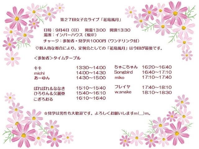 ÃÙ¤¯¤Ê¤ê¤Þ¤·¤¿¤¬¾ÜºÙUP¤Ç¤¹¡£ Æü»þ¡§9·î4Æü¡ÊÆü¡Ë¡¡³«¾ì¡¡13:00¡¡³«±é¡¡13:30 ¥Á¥ã¡¼¥¸¡§»²²Ã¼Ô¡¦¸«³Ø¶¦¤Ë¡¡1000±ß¡Ê¥ï¥ó¥É¥ê¥ó¥¯ÉÕ¡Ë ¡ùĹ¤é¤¯¤´°¦¸Ü¤¤¤¿¤À¤¤Þ¤·¤¿¡Ö²ÖÄ»É÷·î¡×¤Ç¤¹¤¬¡¢º£²ó¤ò¤â¤Ã¤Æ ÄêÎã´ë²è¤Ç¤Î¡Ö²ÖÄ»É÷·î¡×¤Ï½ªÎ»¤È¤¤¤¿¤·¤Þ¤¹¡£ ¤¤¤Ä¤â²¹¤«¤¯¸«¼é¤Ã¤Æ¤¯¤À¤µ¤Ã¤¿¥¤¥ó¥Ð¡¼¥Þ¥¹¥¿¡¼¡õ¥Þ¥Þ¡¢ ¥¹¥¿¥Ã¥Õ¤Î¥¦¥Ã¥Á¡¼¡õsnake¤Á¤ã¤ó¡¢ ¤½¤·¤Æ»²²Ã¤·¤Æ¤¯¤À¤µ¤Ã¤¿¤¿¤¯¤µ¤ó¤Î½÷À¥¢¡¼¥Æ¥£¥¹¥È¤Î³§¤µ¤Þ¡¢¤¢¤ê¤¬¤È¤¦¤´¤¶¤¤¤Þ¤·¤¿ º£¸å¤ÏÉÔÄê´ü¤Ç³«ºÅ¤µ¤»¤Æ¤¿¤À¤¤Þ¤¹¤Î¤Ç¡¢º£¸å¤È¤â¤è¤í¤·¤¯¤ª´ê¤¤¤·¤Þ¤¹¡£ ½Ð±é½ç¤Ê¤É¤Ï¥×