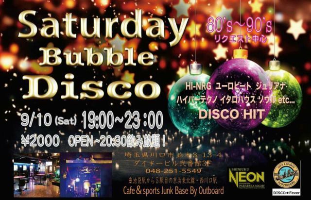 Saturday Bubble DISCO ★80's〜90's DISCO Lovers★ 【日時】9月10日 土曜日 19:00〜23:00! 【料金】2000円 ※open〜20:30まで!飲み放題! 【選曲】80's〜90's DISCO HIT! 【場所】西川口 Cafe&sports Junk Base By Outboard HIーNRG.イタロハウス.ユーロビート.ジュリアナ.ハイパーテクノ.ソウルetc・・・80's〜90's DISCOで流れていたあの当時のナンバーをリクエスト中心にON Air! し・か・も open〜20:30は飲み放題‼ 飲んで、踊って、聴いて、HAPPYなSaturday Nightをお届けします。 スタッフ一同!お越しをお待ちしてます