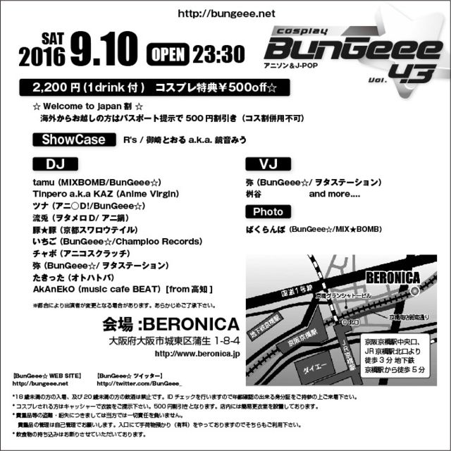 ¥¨¥ì¥¬¥ó¥È¤ÊÊ·°Ïµ¤¤òÅ»¤¦¥¨¥ó¥¿¡¼¥Æ¥¤¥á¥ó¥È¥À¥¤¥Ë¥ó¥°BERONICA ¤½¤ÎBERONICA¤¬°ìÈÕÃæ¥¢¥Ë¥½¥ó¤ÈJ-POP¤ÎÇ®µ¤¤ËÊñ¤Þ¤ì¤ë°ìÌë¡¢BunGeee¡ù º£²ó¤Îshowcase¤Ë¤ÏÍÙ¤ê¼ê9¿Í¡ÜDJ¤Ë¤è¤ë¥Ñ¥Õ¥©¡¼¥Þ¥ó¥¹¥æ¥Ë¥Ã¥ÈR's¤È ÍÙ¤ê¼ê¤È¤·¤Æ³èư¤·¤ÆÍ褿¶À²»¤ß¤¦¤¬ÊѿȤ·¤¿¥¢¥¤¥É¥ë¸æºê¤È¤ª¤ë¤¬Åо졪 ½éÅоìDJ¤Ë¤ÏµþÅÔ¥¹¥ï¥í¥¦¥Æ¥¤¥ë¤«¤éÆÚ¡úÆÚ¡¢¥ò¥¿¥á¥í¤«¤é¤ÏÎ®ÅÆ¡ª ¥¢¥Ë¥³¥¹¥¯¥é¥Ã¥Á¤Î¥Á¥ã¥Ü¡¢¿À¸ÍD¥É¥é¤Î¼ã¼ê¤¿¤¤Ã¤¿¤¬Åо줷¤Þ¤¹¡ª DJ¡¢LIVEACT¡¢VJ¡¢ÍÍ¡¹¤Ê¥Ñ¥Õ¥©¡¼¥Þ¡¼¤¬³Ú¤·¤¤»þ´Ö¤È¶õ´Ö¤òÁϤê½Ð¤·¤Þ¤¹¡£ ¤¼¤Ò¥¢¥Ë¥½¥ó¤äJ-POPÅù¤Î²»³Ú¤È¥³¥¹¥×¥ì¤Ç