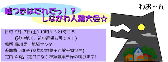 9月17日(土)に品川で人狼会を開催します! 昨年も実施しましたが、今回はより広い部屋になりパワーアップ☆ みんなで楽しく疑心暗鬼になりましょう♪ 当会の趣旨として、「誰もが楽しく遊べるゲーム会」をモットーにしています。 人狼は、初心者、初級者の方にはなかなか敷居が高く、難しいゲームです。 ですので、今回は「はじめて村」と「経験者村」に分けて遊ぶことを考えています。 *初心者、初級者の定義はいろいろありますが、 ・人狼が初めて、あるいはルールもほとんどしらない ・「CO」「ロラ」「村スラ」などの用語がわか