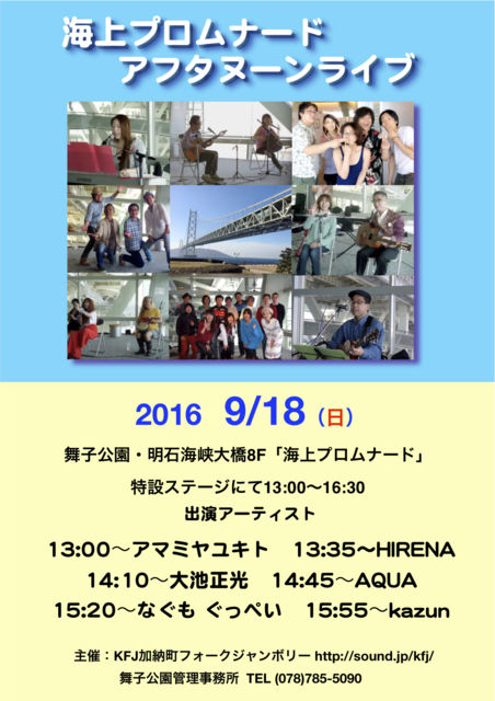 9月18日(日)舞子公園 海上プロムナードライブ 毎月第三日曜日 KFJ加納町フォークジャンボリー http://sound.jp/kfj/ 主催の定期ライブイベント 。明石淡路海峡大橋8F 海上プロムナード http://www.hyogo-park.or.jp/maiko/contents/sisetsu/area_prom.html 特設ステージにて、13:00〜16:30無料(但し入館料 300円が必要です) 13:00〜アマミヤユキト https://www.facebook.com/masanobu.aoki.984 13:35〜HIRENA https://www.facebook.com/Hiroponz71/ 14:10〜大池 正光 https://www.facebook.com/masamitsu.oike 14:45〜AQUA htt