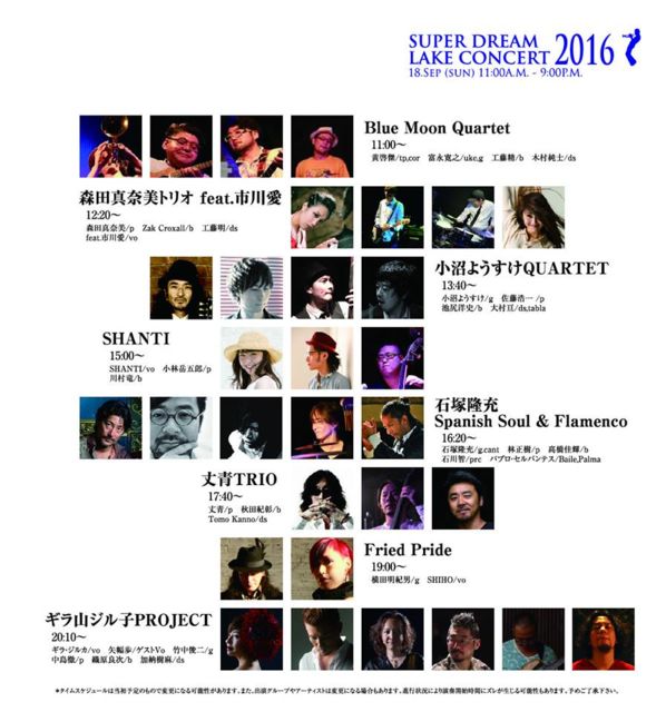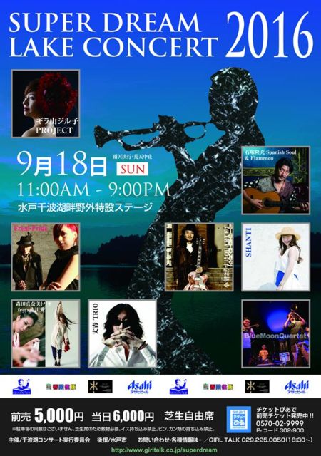 2016年9月18日(日) 場所 千波はなみずき広場 茨城県 水戸市 千波町3064 9/18(日) SUPER DREAM LAKE CONCERT 2016 http://www.girltalk.co.jp/superdream/ 国内トップジャズミュージシャンが集結!今年はフラメンコダンサーも踊りで華を添えます。 ❏ギラ山ジル子PROJECT(ギラ・ジルカ/vo 矢幅歩/ゲストVo 竹中俊二/g 中島徹/p 織原良次/b 加納樹麻/ds) ❏FRIED PRIDE(横田明紀男/g SHIHO/vo) ❏SHANTI(小林岳五郎/p 川村竜/b) ❏ブルームーンカルテット ❏小沼ようすけ/gQartet(佐藤浩一 /p