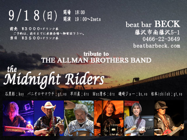 LIVE at Beat BAR BECK オールマンブラザースバンド トリビュートナイト the Midnight Riders Mac清水 drs 早川眞 drs 石黒彰 key 磯崎ジョー bs,vo 松本ichioh gt, vo パニオロヤマウチ gt, vo 紀ノ国屋バンド、南佳孝、チャーをはじめ 数々のトップミュージシャンを支えるMac清水。 野毛洋子、garth hudson、jaimoe などと セッションを繰り返してきた磯崎ジョー。 ふたりを中心とした今回のメンバーも猛者揃い。 次回はどんな組み合わせになるかわからない。 お見逃しなく!