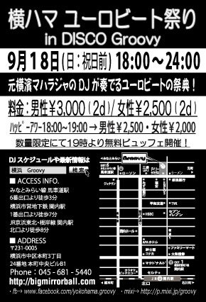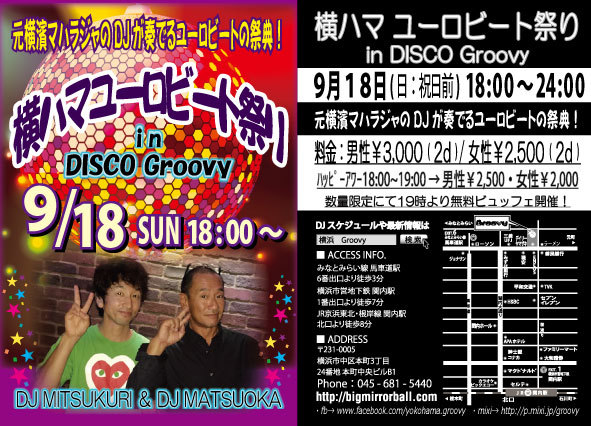 元横濱マハラジャのDJ'sが奏でるユーロビートの祭典です!ノリノリ踊れる音満載にて夢の一夜をお贈りします♪ 【DJ's】 MATSUOKA / MITSUKURI 【開催時間】 18:00〜24:00 【ハッピーアワー料金 / 18:00〜19:00にご来店の方】 男性:¥2,500/2Drinks+ビュッフェ付 女性:¥2,000/2Drinks+ビュッフェ付 【料金 / 19:00以降ご来店の方】 男性:¥3,000/2Drinks+ビュッフェ付 女性:¥2,500/2Drinks+ビュッフェ付 (ビュッフェは19時頃よりご用意しますが数量限定のため無くなりしだい終了となります。ご了承ください。)
