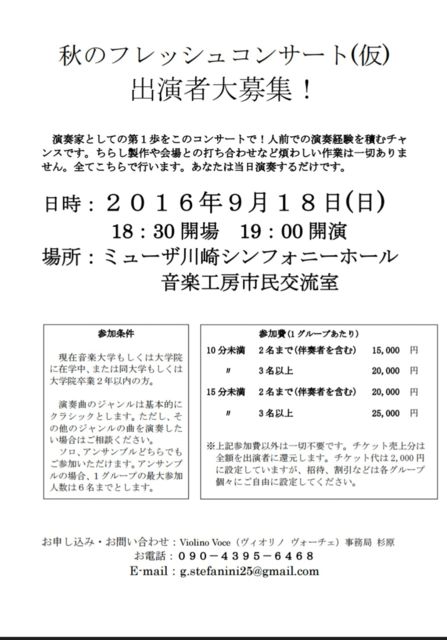 チラシの通り、コンサート出演者を募集中です。 たくさんの聴衆の前での演奏経験を積むチャンスです ご興味のある方は、直接メッセージか、チラシの連絡先に連絡ください。 たくさんのご応募、お待ちしております。