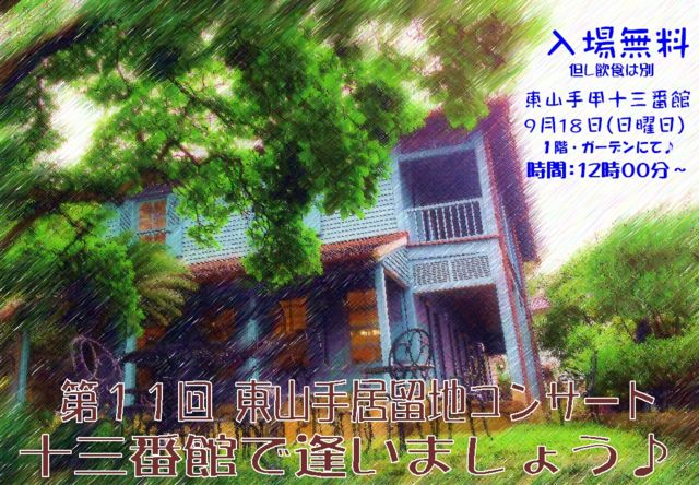 [第11回]オランダ坂居留地コンサート 〜十三番館で逢いましょう〜 今回の「オランダ坂居留地コンサート」は 「ながさき居留地まつり」の日に合わせてのイベントです。 ご当地ソングを含めた演目、あと試行錯誤で 盛り沢山の内容でお送りしたいと思います。 南山手〜東山手・・ぜひ、さるいて寄ってください。。 もちろん入場は無料です(*^^*) 【出演者】 ・JUN@子煩悩 ・MEGUMI ・Haku-kawa ・栗原眞茂 ・かまお 【開演時間】12:00〜