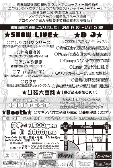 ¼¡²ó¤Î´ØÀ¾¶õ¹Á£Ë£É£Ø²»³Úº×vol.7¤Ï¡¢´ØÀ¾¶õ¹Á±ØÆî¹¾ì¤Ë¤Æ9/18¤Ç¤¹¡£ ½Ð±é¤Ï¡¢À¾Â¼²ÃÆà¡¦¤ï¤¿¤Ê¤Ù¤æ¤¦¡¦andRE¤Î3ÁȤÇ12»þ¤«¤é£³¥¹¥Æ¡¼¥¸¡¦¡¦¡¦ ¤½¤·¤ÆÍâÆü9/19¤Ï¡¢vol.8¤ò¡¢´ØÀ¾¶õ¹Á±ØÆî¹¾ì¤Ë¤Æ³«ºÅ¤Ç¤¹¡£ ½Ð±é¤Ï¡¢Seira¡¦Maitea¡¦¤Ä¤Á¤¿¤Ë¤Á¤«¤Î3ÁȤÇ12»þ¤«¤é£³¥¹¥Æ¡¼¥¸¡¦¡¦¡¦