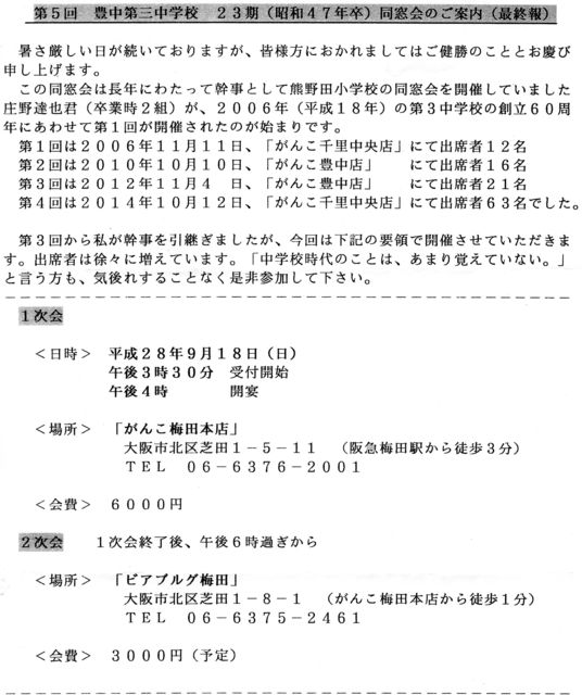 Âè23´üÀ¸Æ±Áë²ñ¤Î¤´°ÆÆâ¡Ê¾¼ÏÂ47ǯ´¡¡¾¼ÏÂ31ǯ4·î¡Á32ǯ3·îÀ¸¤Þ¤ì¡Ë 3ǯ11ÁÈ¡ÊÄ¹ÈøÀèÀ¸¡Ë´¶ÈÀ¸¤Î½©¼Ä¡Ê¤¢¤¤·¤Î¡Ë¤Ç¤¹¡£23´üÀ¸Æ±Áë²ñ¤Î¾ÜºÙ¤¬·èÄêÃפ·¤Þ¤·¤¿¡£ Æü»þ¡§Ê¿À®28ǯ9·î18Æü¡ÊÆü¡Ë¡¡ ¡¡¡¡¡¡¸á¸å3»þ30ʬ¼õÉÕ³«»Ï¡¡ ¡¡¡¡¡¡¸á¸å4»þ¡¡¡¡³«±ã ¾ì½ê¡§¡Ô¤¬¤ó¤³ÇßÅÄËÜŹ¡Õ¡¡Âçºå»ÔË̶è¼ÇÅÄ1¡Ý5¡Ý11¡¡¡ÊºåµÞÇßÅıؤ«¤éÅÌÊâ3ʬ¡Ë¡¡TEL 06-6376-2001 ¤¬¤ó¤³ÇßÅÄËÜŹ ¥Û¡¼¥à¥Ú¡¼¥¸¡§ http://www.gankofood.co.jp/shop/detail/wa-umedahonten/ ²ñÈñ¡§6,000±ß Æó¼¡²ñ¡§Æ±Áë²ñ½ªÎ»¸å¡¢¸á¸å6»þ²á¤®¤«¤é¤ÎͽÄê¤Ç¤¹¡£