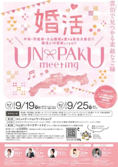 奥村隼也さんの婚活イヴェントMCが決定いたしました。 『UN-PAKUmeeting(ウンパクミーティング)2016』 【主催】 松江市定住企業立地推進課 【米子会場】 2016年9月19日(月・祝) 10時〜15時30分 米子コンベンションセンター BiG SHiP 鳥取県米子市末広町294 【松江会場】 2016年9月25日(日) 10時〜15時30分 松江テルサ 島根県松江市朝日町478-18 【お手伝い】 若槻裕子 (総合MC/米子・松江) 奥村隼也 (MC/米子・松江) 松島ゆうこ (コミュニケーションアドヴァイザー/米子・松江) 山崎瑞穂 (MC/米子) 布野まち子 (MC/松