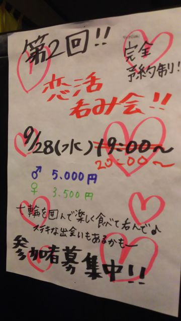 こんにちわ 長泉の下土狩駅目の前、 赤ホルモンスコップ下土狩にて、 恋活パーティをやります 七輪を囲んでホルモン、セセリにカルビと、美味い肉を一緒に焼いてお酒を呑む 普通の居酒屋での恋活よりも共同作業があるぶん、会話が生まれやすいし、緊張もほぐれやすいです 2時間飲み放題 料理付き!! 男性5,000円 女性3,500円です
