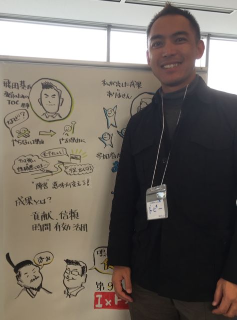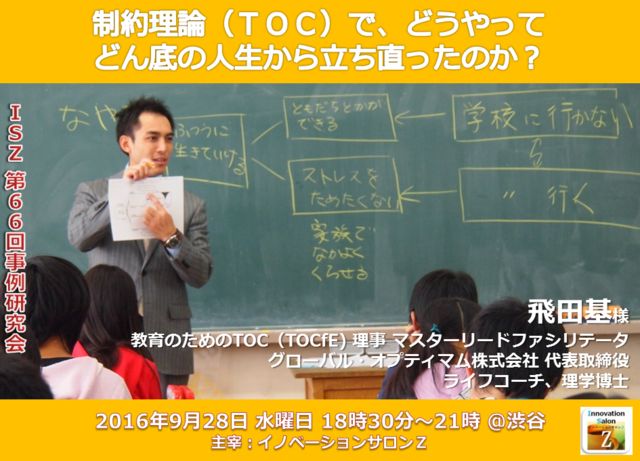 制約理論(TOC)でどうやってどん底の人生から立ち直ったのか? イノベーションサロンZ 第66回事例研究会 (9月28日・渋谷) 教育のためのTOC/理事マスターリードファシリテータ 飛田基様 http://www.geocities.jp/kanglocorp/isz2016_0928.html https://www.facebook.com/events/845466448917378 <Before> 人間関係に苦しみ、小学校は不登校。 持病のアスペルガー症候群と二次障害に苦しみ、 学校の出席日数も足りない。 中学校では全教科補習。 素行も悪く警官に補導される。 学校の「叱られソファー」の常連。 生