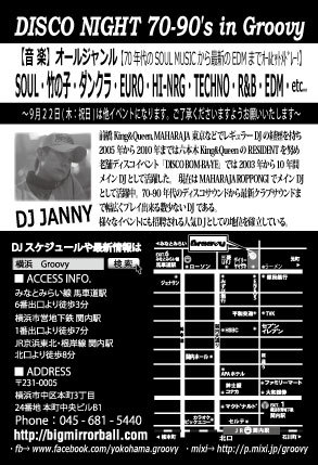 ¡Ú¤ª¤Ê¤¸¤ßGroovy¤Î¥Ç¥£¥¹¥³¥Ê¥¤¥È¡Û70ǯÂå¤ÎSOUL¥ß¥å¡¼¥¸¥Ã¥¯¤«¤éºÇ¿·¤ÎEDM¤Þ¤Ç¥ª¡¼¥ë¥Ò¥Ã¥È¥á¥É¥ì¡¼¡ªÍÙ¤ì¤ë¶ÊÀ¹¤êÂô»³¤Ç¤ªÂ£¤ê¤·¤Þ¤¹♬ ¡Ú¥ª¡¼¥¬¥Ê¥¤¥¶¡¼¡Û£Ê£Õ£Î ¡Ú£Ä£Ê¡ÛJANNY¡ÊMAHARAJA ROPPONGI¡Ë ¡Ú²»³Ú¡ÛALL GENRE ¡ÊSOUL¡¢Ãݤλҡ¢¥À¥ó¥¯¥é¡¢EURO¡¢HI-NRG¡¢TECHNO¡¢R&B¡¢EDM¡¢etc¡Ä¡Ë ¡Ú³«ºÅ»þ´Ö¡Û 19:00¡Á24:00 ¡ÚÎÁ¶â¡Û ÃËÀ¡§¡ï2,500/2Drinks¡Ü¥Ó¥å¥Ã¥Õ¥§ÉÕ ½÷À¡§¡ï2,000/2Drinks¡Ü¥Ó¥å¥Ã¥Õ¥§ÉÕ ¡Ê¥Ó¥å¥Ã¥Õ¥§¤Ï19»þ¤è¤ê¤´ÍѰդ·¤Þ¤¹¤¬¿ôÎ̸ÂÄê¤Ë¤Ä¤Ìµ¤¯¤Ê¤ê¼¡Â轪λ¤È¤Ê¤ê¤Þ¤¹¡Ë