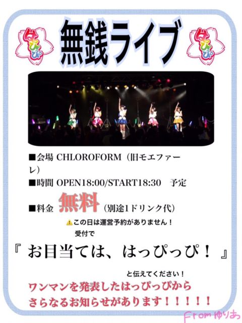 ¡Ö̵Á¬¥é¥¤¥Ö¡× Æü»þ¡§9/29(ÌÚ) ³«¾ì18:30 ³«±é19:00 ²ñ¾ì¡§½©ÍÕ¸¶ CHLOROFORM¡Êµì¥â¥¨¥Õ¥¡¡¼¥ì¡Ë ÎÁ¶â¡§ ̵ÎÁ(1DÊÌ) ½Ð±é¡§¤Ï¤Ã¤Ô¤Ã¤Ô/UP¥í¡¼¥Á/¥¢¥ó¥À¡¼¥Ó¡¼¥¹¥Æ¥£¡¼/Ê¡±Ê¹¬³¤/¤Ô¤å¤¢Ì¼/Angelip