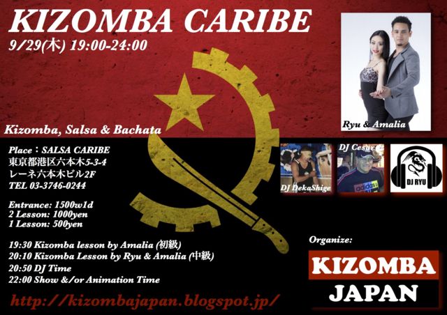 ¡úKIZOMBA CARIBE¡ú ¸½ºß¡¢À¤³¦Åª¤Ëή¹ÔÃæ¤ÎKizomba¤ò»×¤¦Â¸Ê¬³Ú¤·¤ß¤Þ¤·¤ç¤¦¡ª ¥Ó¥®¥Ê¡¼¸þ¤±Kizomba¥ì¥Ã¥¹¥ó¤È¡¢ Ãæµé¥¢¡¼¥Ð¥óKizomba¥ì¥Ã¥¹¥ó¤¬¤¢¤ë¤Î¤Ç¤·¤Ã¤«¤ê³Ø¤Ù¤Þ¤¹¡£ ¥Ñ¡¼¥Æ¥£¤ÎÁª¶Ê¤ÏKizombaÃæ¿´¤Ç¡¢Salsa¡¢Bachata¡¢¤Ê¤É¤Î¥ª¡¼¥ë¥é¥Æ¥ó¤ò³Ú¤·¤á¤Þ¤¹¡£²ñ¾ì¤Ï¡¢Ï»ËÜÌڤο͵¤¥Ð¡¼¥µ¥ë¥µ¥«¥ê¥Ù¤Ç¤¹¡£ ¢¡Æü»þ¡§9·î29Æü¡ÊÌÚ¡Ë19:00-24:00 ¢¨Âè5ÌÚÍËÆü Äê´ü³«ºÅ ¢¡¾ì½ê¡§Ï»ËÜÌÚ¡ØSALSA CARIBE¡Ù ÅìµþÅÔ¹Á¶èÏ»ËÜÌÚ5-3-4¡¡¥ì¡¼¥ÍÏ»ËÜÌÚ¥Ó¥ë2F TEL: 03-3746-0244 http://www.salsacaribe.jp/ ¢¡ÎÁ¶â Entrance: 1500w