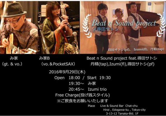 ¤ß²È¤µ¤ó¤ÈIzumi¤µ¤ó¥×¥í¥¸¥§¥¯¥È¤ÎÁÇŨ¤Ê¥³¥é¥Ü¥é¥¤¥ÖÂè3ÃÆ¤Ç¤¹¢ö ¾¤Ç¤Ï¸«¤é¤ì¤Þ¤»¤ó¤è¡Á^^ 2016ǯ9·î29Æü(ÌÚ) 18:00¡¡OPEN 19:30¡¡START 19:30¡Á¡¡¤ß²È 20:45¡Á¡¡Izumi trio feat.ÆÀÅÄ¥µ¥È¥· Free Charge(ÅꤲÁ¬¥¹¥¿¥¤¥ë) ¢¨¥Æ¡¼¥Ö¥ë¥Á¥ã¡¼¥¸500±ß+¤´°û¿©¤ò¤ª´ê¤¤¤¤¤¿¤·¤Þ¤¹ ³§ÍͤΤ´ÍèŹ¤ò¿´¤è¤ê¤ªÂÔ¤Á¤·¤Æ¤¤¤Þ¤¹¢ö