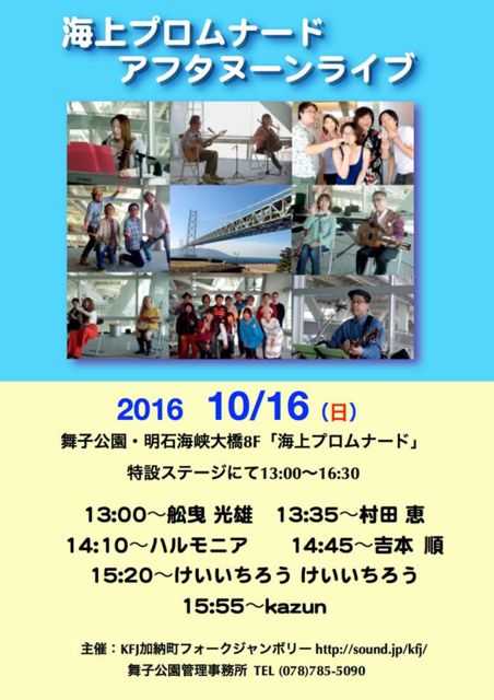 10·î16Æü¡ÊÆü¡ËÉñ»Ò¸ø±à ³¤¾å¥×¥í¥à¥Ê¡¼¥É¥é¥¤¥Ö Ëè·îÂè»°ÆüÍËÆü KFJ²ÃǼĮ¥Õ¥©¡¼¥¯¥¸¥ã¥ó¥Ü¥ê¡¼ http://sound.jp/kfj/ ¼çºÅ¤ÎÄê´ü¥é¥¤¥Ö¥¤¥Ù¥ó¥È ¡£ÌÀÀÐøϩ³¤¶®Âç¶¶8F ³¤¾å¥×¥í¥à¥Ê¡¼¥É http://www.hyogo-park.or.jp/maiko/contents/sisetsu/area_prom.html ÆÃÀߥ¹¥Æ¡¼¥¸¤Ë¤Æ¡¢13:00¡Á16:30̵ÎÁ¡Ê⤷Æþ´ÛÎÁ 300±ß¤¬É¬ÍפǤ¹¡Ë 13:00¡ÁçÕÛª ¸÷ͺ¡¡https://www.facebook.com/kouta.funabiki 13:35¡Á¼ÅÄ ·Ã¡¡https://www.facebook.com/setouchikayaker 14:10¡Á¥Ï¥ë¥â¥Ë¥¢¡¡https://www.facebook.com/ayako.ito.3363 14:45¡ÁµÈËÜ ½ç¡¡h