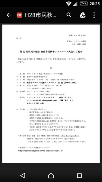 日 時:平成28年10月10日(月)9時25分開始 会 場:新青森県総合運動公園テニスコート(マエダアリーナテニスコート) 種 別:一般A(44歳以下の男女) 一般B(コンソレーション:敗者復活) 参加料:1人1,500円 競 技:リーグ戦及びトーナメント方式 資 格:日本ソフトテニス連盟に会員登録している者→1500円かかりますが、すぐできます。 ペア申し込みを原則とする。 審判の資格は必要ないらしい。