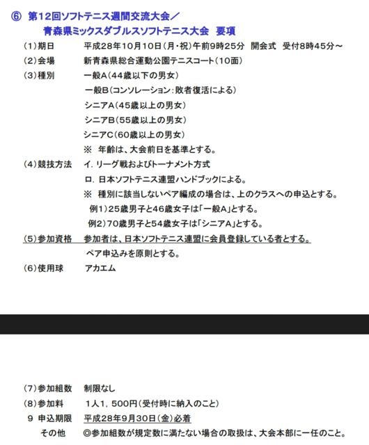 日 時:平成28年10月9日(日曜日)受付8:30 試合開始9:30〜 場 所:筒井スポーツ公園 種 目:男女A・B級(個人戦) 参加料:1ペア3,000円 ※当日参加は認めない ※選手変更は8:30まで認める ※青森市民もしくは実家が青森市もしくは職場が青森市 締め切り明日です。申し訳ない。