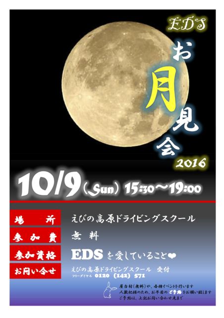 EDS恒例 お月見会のお知らせ キ…( *゚)キタ!( *゚∀)キタ!!(*゚∀゚*)キタ━━!!! 朝夕涼しくなり、秋の気配を感じる今日この頃。 みなさま、いかがお過ごしでしょうか? EDS恒例 満月お月見会のシーズンが またまたやってまいりましたーーーー 各種イベント盛りだくさん♡ 各種ゲーム盛りだくさん♡ 各種屋台も盛りだくさん♡ もちろん 全て無料だーーー!!! 皆さまのご来校 心よりお待ち申し上げております ●日時● 2016年10月9日 日