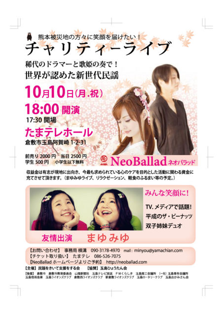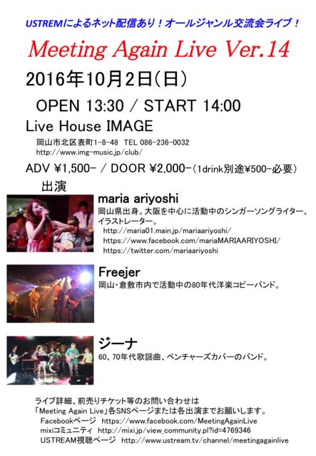 10月2日(日)、岡山市北区表町のオランダ通りの Live House IMAGE にて、オールジャンルライブ「Meeting Again Live Ver.14」を行います。