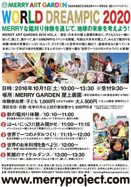 【募集中!10/1(土)MERRY ART GARDEN ダンス出演者&当日運営スタッフ】 今回のテーマ MERRYな稲刈り体験を通して、地球の未来を考えよう 【スタッフ業務内容】 ・歌&ダンス・ワークショップへの出演・指導 ・ご参加のお子様、ご家族とのふれあい ・農園お手伝い ・お料理づくり ・会場の設営・撤収 などなど 【MERRY ART GARDENとは?】 六本木の屋上農園で、子ども達と一緒に野菜の種まきから収穫までを行い、食について学んでいます。 採れたての野菜はその場で調理し、屋上でランチタイム。 食事の後