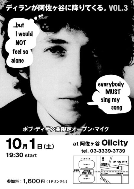 過去2回の盛況に気を良くして、ボブ・ディラン曲限定のオープンマイクの第3回目を開催します。 ストレート・カバーから独自アレンジ、英語のままでも日本語訳でも、また、ディランが歌った他人作の曲の孫カバーでもかまいません。 参加人数にもよりますが、各自数曲ずつは歌ってもらえると思います。もちろん1曲だけでも大丈夫です。あなたのディラン愛を臆面もなく表現しましょう。 ・日時:10月1日(土)19:30スタート ・場所:阿佐ヶ谷 Oilcity(tel. 03-3339-3739) http://www.chicagoplanning.com/oilcity.html ・参加料:1,