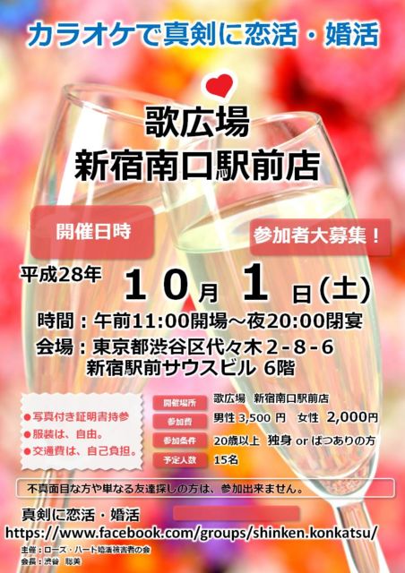 管理人様、スペースを失礼します。 イベントのご案内です。 お誕生日をお祝いをしたいのも兼ねまして イベントを開催する予定です。 20歳以上で真剣に恋人を探していたり、 将来の結婚相手を探していて イベントに参加する男女を募集しています。 ゆる〜く歌う事が、好きで真剣に恋活・婚活を 頑張ってるよという男女集まって下さい。 メインは、真剣に恋活・婚活で恋のお相手を見つける事です。 歌えないけど真剣に恋活・婚活をする方も大歓迎。 歌が、大好きで真剣に恋活・婚活をする方も大歓迎です。 真剣に恋活・婚活をされて