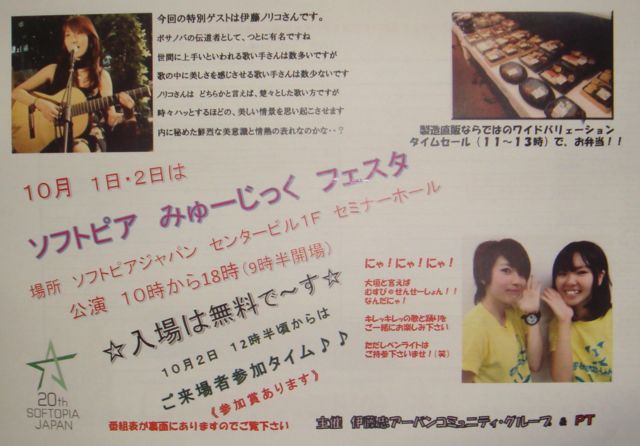 ソフトピアジャパンセンタービル 1階 セミナーホールにて 「ソフトピアみゅーじっくフェスタ 2016」を開催します。 出演者は地元の皆様で、バンド・カラオケ・ミニショーetc 盛りだくさんの内容です。 入場は無料となっていますので、お暇な方は遊びに来て下さい。 入場可能人数が180名程度となっていますので 譲り合ってのご利用をお願いします。 写真は参考程度です。