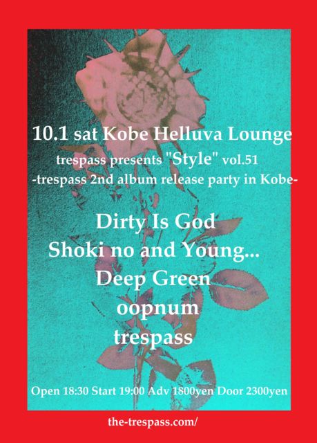 10月1日(土)神戸HELLUVA LOUNGE trespass presents "Style"vol.51 -trespass 2nd album “Expanded Memories” release party in Kobe!!- open18:30 start19:00 adv1800 door2300 ●Dirty Is God ●初期のアンドヤング ●DEEP GREEN ●oopnum ●trespass 自主企画第51弾となる今回はtrespassの2枚目のフル・アルバムとなる"Expanded Memories"のリリース・パーティー神戸編!! もちろんゲスト・アーティスト陣も猛烈!! ★泥沼で踊るような変則ダンス・チューンでオーディエンスを痙攣と狂乱へ誘う!昨年のCH CARGOからの傑