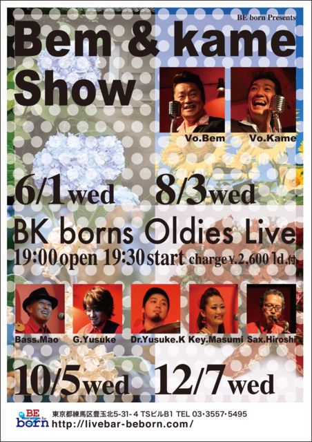 ÎýÇÏmusic & live bar BEborn ËÜÆü10·î5Æü(¿åÍËÆü)¤Ï¡¢ BEborn¥Ð¥ó¥É¤Ë¤è¤ë¥ï¥ó¥Þ¥ó¥é¥¤¥Ö ¡ÖBem&Kame Show¡× ¥¨¥ë¥Ó¥¹¥·¥ç¡¼¤â¤Õ¤¯¤á¡¢ ¤Ë¤®¤Ë¤®¤·¤¯3¥¹¥Æ¡¼¥¸¤ª¤³¤Ê¤¤¤Þ¤¹¡£ ¤¤¤é¤·¤Æ¤¤¤¿¤À¤¤¤¿¤ªµÒÍͤ˳ڤ·¤ó¤Ç¤¤¤¿¤À¤±¤ë¥¹¥Æ¡¼¥¸¤Ë¤·¤¿¤¤¤È»×¤Ã¤Æ¤ª¤ê¤Þ¤¹¡£ À§ÈóÍ·¤Ó¤Ë¤¤¤é¤·¤Æ¤¯¤À¤µ¤¤¤Í¡£ ¤ªÂÔ¤Á¤·¤Æ¤ª¤ê¤Þ¤¹¡£ ÌÀÆü¡¢10·î6Æü(ÌÚÍËÆü)¤Ï ¡ÚŹµÙÆü¡Û ¡ú¤ªµ¤³Ú¥é¥¤¥Ö(¥Î¥ë¥Þ̵¤·)½Ð±é¼ÔÊç½¸Ãæ¡ª ¤ªµ¤³Ú¥é¥¤¥Ö¾ÜºÙ ¤ªµ¤³Ú¥é¥¤¥Ö¤È¤Ï¡¢½Ð±é¼Ô¤Î³§Íͤɤ¦¤·¤¬¡¢¤ª¸ß¤¤¤Î¤ªµÒÍÍ¤È¤Ê¤ê ¥×¥í¡¢¥¢¥Þ¤òÌä¤ï¤º³Ú¤·¤¯¥é¥¤¥Ö¤ò¤·¤Þ¤·¤ç¤¦¤È
