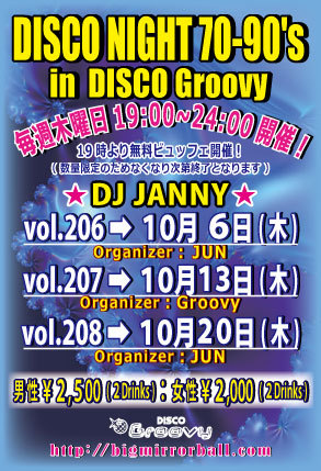 【おなじみGroovyのディスコナイト】70年代のSOULミュージックから最新のEDMまでオールヒットメドレー!踊れる曲盛り沢山でお贈りします♬ 【オーガナイザー】JUN 【DJ】JANNY(MAHARAJA ROPPONGI) 【音楽】ALL GENRE (SOUL、竹の子、ダンクラ、EURO、HI-NRG、TECHNO、R&B、EDM、etc…) 【開催時間】 19:00〜24:00 【料金】 男性:¥2,500/2Drinks+ビュッフェ付 女性:¥2,000/2Drinks+ビュッフェ付 (ビュッフェは数量限定につき無くなり次第終了となります)