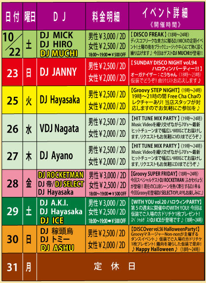 DISCO Groovy ¤Î10·î¤ÎÂ裱¶âÍËÆü¤Ï¡ª¡ÚDJ A.K.I.¡õDJ Hayasaka¡Û¤Ë¤è¤ë¡ÔDiscotheque Friday Night¡ÕDISCO DJ¤Ê¤é¤Ç¤Ï¤ÎÀä̯¤Ê¥È¡¼¥¯¡õDJ¥×¥ì¥¤¤Ë¤Æ²£Éͤβֶâ¥Ê¥¤¥È¤òÀ¹¤ê¾å¤²¤Þ¤¹¡ª¥ê¥¯¥¨¥¹¥È¤Ë¤â½ÐÍè¤ë¸Â¤ê¤´ÂбþÃפ·¤Þ¤¹¤Î¤ÇDJ¤Þ¤Ç¤ªµ¤·Ú¤Ë¤É¤¦¤¾¢ö ¡Ú²»³Ú¡Û¥ª¡¼¥ë¥¸¥ã¥ó¥ë Soul¡¢Funk¡¢Dance Classics¡¢R¡õB¡¢EDM¡¢Euro¡¢etc... ¡Ú³«ºÅ»þ´Ö¡Û 18¡§00¡Á24¡§00 ¡Ú¥Ï¥Ã¥Ô¡¼¥¢¥ï¡¼ÎÁ¶â / 18:00¡Á19:00¤Ë¤´ÍèŹ¤ÎÊý¡Û ÃËÀ¡§¡ï2,500/2Drinks¡ÜÃæ²Ú¥Ó¥å¥Ã¥Õ¥§ÉÕ ½÷À¡§¡ï2,000/2Drinks¡ÜÃæ²Ú¥Ó¥å¥Ã¥Õ¥§ÉÕ ¡ÚÎÁ¶â / 19:00°Ê¹ß¤´ÍèŹ¤Î