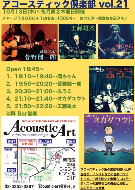 Acoustic Club vol.21 10月13日(木) 毎月第二木曜日 Open 18:45 charge1000yen+Order Eve of Festival Fuko's Birthday