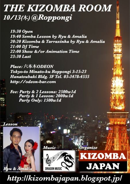★THE KIZOMBA ROOM @六本木★ Kizombaはアンゴラ発祥で、世界的に流行中のダンス。ロマンチックでセクシーな世界に酔いしれましょう! Kizombaにはまっている方はもちろん、初めての方もレッスンがあるので楽しめます。 会場はODEON Bar。オシャレでカッコイイお店です。 是非この機会に、話題のKizombaを踊りましょう♪ ◆日時:10月13日(木)19:30-23:30 ◆場所:ODEON Tokyo-to Minato-ku Roppongi 3-15-23 Hanatsubaki Bldg. 3F Tel. 03-3478-4555 http://odeon-bar.com/ ◆ 料金: Party & 2 Lesson: 2500w1d