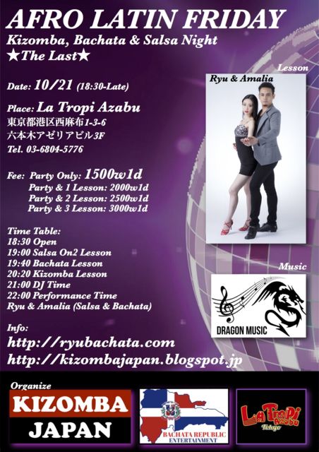 ★AFRO LATIN FRIDAY★La Tropi Azabu 金曜日のアフロラテンナイトは今回でラストさせて頂きます。今まで参加してくれた皆さんありがとうございました!レッスンから参加する方にアフロラテンミックスのCDプレセントします、パフォーマンスはRyu & Amaliaのバチャータとサルサで踊ります。お待ちしています!! 今後のアフロラテンナイトは「Afro Latin Tuesday』として火曜日に開催します、詳しいスケジュールお知らせます。 10/25, 12/6, 12/27 1/3, 1/10, 1/17, 1/24, 1/31 2/7, 2/14, 2/21, 2/28 新しい会場は六本木New Planetです。