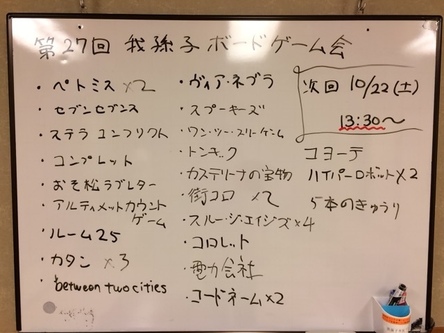 【日時】平成28年10月22日(土) 13:30〜20:50 ※途中入退場は自由です 【場所】我孫子市民プラザ 和室 (JR常磐線 我孫子駅より徒歩5分) http://members3.jcom.home.ne.jp/abikopla/index.html (無料駐車場あり) 【参加費】500円 【定員】25名 ----------------------------------------------------------------- コミュ主様、場所をお借りします。 東葛地域でのボードゲームをもり立てるために我孫子でもゲーム会を立ち上げました。 ボードゲーム初心者からベテランゲーマーまでが気軽に楽しめる会を目指