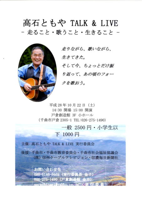 長野県千曲市戸倉でのコンサートです。 昼間なのでやや遠くても日帰りで行けると思います。 今年は歌い始めて50年という高石さんの歌とお話が聴けそうです。 **************************** 平成28年10月22日(土) 14:30 会場 15:00 開演 戸倉創造館 3F 小ホール お問い合わせ 080-5146-8669(実行委員長 金子) 026-275-1490(戸倉創造館 金井) **************************** 個人的には「大往生コンサート」へは行けな