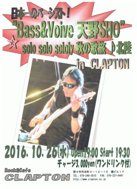 10月26日(水) 19:00オープン 19:30スタート 『 Bass&Voise 天野SHO LIVE 』 神戸から日本一のベーシスト Bass&Voive 天野SHO 1年ぶり2回目のCLAPTONライブです。 〈SHO AMANO プロフィール〉 伝説のハードロックバンド“E.B.S”のベーシスト&ヴォーカリストとして精力的に音楽活動を始める。 その後、数々のミュージシャンとユニットを結成。 1995年の阪神淡路大震災をきっかけに『BASS & VOICE』という独自のスタイルでソロ活動も開始。 彼にしかできないSHOワールドを確立している。 ロックスピリッツを具現