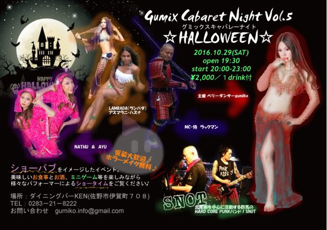 Gumix cabaret night Vol.5 ¡Ê¥°¥ß¥Ã¥¯¥¹¥¥ã¥Ð¥ì¡¼¥Ê¥¤¥È¡Ë ¡ú¡ù¥Ï¥í¥¦¥£¥ó¡ù¡ú £±£°·î£²£¹Æü¡ÊÅÚÍË¡Ë ¥ª¡¼¥×¥ó£±£¹»þ£³£°Ê¬ ¥¹¥¿¡¼¥È£²£°»þ¡Á£±£±»þ¡Ê¤½¤Î¸åÊÄŹ¤Þ¤Ç¼«Í³¤Ë°û¤ß²ñ¡Ë Æþ¾ìÎÁ¡¡2,000±ß¡¿£±dÉÕ¤ ¾ì½ê¡¡¥À¥¤¥Ë¥ó¥°¥Ð¡¼KEN¡Êº´Ìî±Ø¤¹¤°¶á¤¯¡Ë ¥·¥ç¡¼¥Ñ¥Ö¤ò¥¤¥á¡¼¥¸¤·¤¿°û¤ß²ñ¥¤¥Ù¥ó¥È¡¢ ¥°¥ß¥Ã¥¯¥¹¥¥ã¥Ð¥ì¡¼¥Ê¥¤¥È¢ö¢ö ÈþÌ£¤·¤¤¤ª¿©»ö¤ä¤ª¼ò¤È¶¦¤Ë¡¢¥À¥ó¥¹¡¦²Î¡¦¥Ð¥ó¥É¡¦¥ß¥Ë¥²¡¼¥àÅù¤ò¤ª³Ú¤·¤ß¤¯¤À¤µ¤¤¡£ º£²ó¤Ï¥Ù¥ê¡¼¥À¥ó¥¹¡¢¥é¥ó¥Ð¥À¡¢¥¸¥ã¥º¥Ô¥¢¥Î¡¢¥·¥ó¥¬¡¼¡¢¥Ñ¥ó¥¯¥Ð¥ó¥É¤Î¥Ñ¥Õ¥©¡¼¥Þ¡¼¤¬À¹¤ê¾å¤²¤Þ¤¹¡ª ²¾