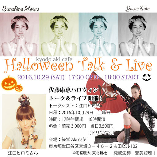 Halloween Talk & Live º´Æ£¹¯·Ã¥Ï¥í¥¦¥£¥ó¥È¡¼¥¯¡õ¥é¥¤¥Ö³«ºÅ¡ª ¡ÉËâ²üË¡»Õ ¼ÙÈþÅÐÃÅ¡ª¡É ¥²¥¹¥È¡§¹¾¸ý¥Ò¥í¥ß ÆüÄø¡§2016ǯ10·î29Æü ÅÚÍËÆü »þ´Ö¡§17»þȾ³«¾ì 18»þ³«±é¡Ê¥é¥¤¥Ö~µÙ·Æ~¥È¡¼¥¯¡Ë ÎÁ¶â¡§Á°Çä 3,000±ß ÅöÆü3,500±ß¡Ê£±¥É¥ê¥ó¥¯°Ê¾åÊÌÅÓ¡Ë ²ñ¾ì¡§·ÐƲ Aki cafe ÅìµþÅÔÀ¤ÅÄë¶èµÜºä£³¡Ý£´£¶¡Ý£²µÈÅÄ¥Ó¥ë102 ¥Á¥±¥Ã¥È¤Ï¡¢http://shop.yasuesato.com/ ¤Ë¤ÆÁ°Çä¤ê³«»Ï ²çϵ¤Ç¶¦±é¤·¤¿¹¾¸ý¥Ò¥í¥ß¤µ¤ó¤ò¥²¥¹¥È¤Ë¤ª·Þ¤¨¤·¤Æ¥È¡¼¥¯¥¤¥Ù¥ó¥È¤ò¹Ô¤¤¤Þ¤¹¡£ ¹¾¸ý¥Ò¥í¥ß¤µ¤ó¤Ï¡¢NUM handmade ¤È¤¤¤¦¥ê¥Ü¥ó¥â¥Á¡¼¥Õ¤Î»¨²ß¥Ö¥é¥ó¥É¤ò¼ê³Ý¤±¤Æ¤¤