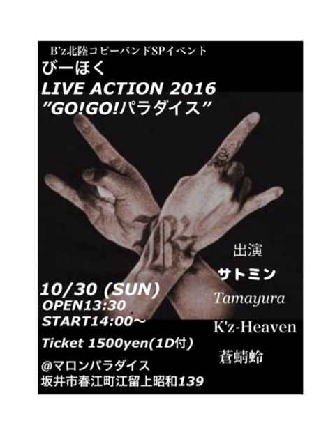¤Ó¡¼¤Û¤¯LIVE ACTION 2016 -GO!GO!¥Ñ¥é¥À¥¤¥¹- ¢¨¸½ºßLIVE´ÑÀï¼Ô¡£¥«¥é¥ª¥±TIME»²²Ã¼Ô¡£ÂǤÁ¾å¤²»²²Ã¼Ô¡£Êç½¸Ãæ¤Ç¤¹¡ª¢¨ Ž¢²ñ¾ì¥¥ã¥ÑÌó80¿Í¡£Ž£ 10/20¸½ºß¡¢75¿Í»²²ÃͽÄê¡£ ¼ã´³Ì¾¤Î¤ß!!Ê罸¤¤¤¿¤·¤Þ¤¹ (mixi°Ê³°¤Î»²²Ã¼Ô¤â¿¿ô»²²Ã¤µ¤ì¤Þ¤¹) ¤ªµ×¤·¤Ö¤ê¤ÎB'zËÌΦ¥³¥Ô¡¼¥Ð¥ó¥ÉLIVE¥ª¥Õ²ñ º£²ó¤ÏÊ¡°æ¤Ç¤Î³«ºÅ¤Ç¤¹ Ëè²óÂçÀ¹¶·¤ÎLIVE¥¤¥Ù¥ó¥È¤Ç¤¹¤¬ º£²ó¤ÏÆÃ¤Ëɬ¸«¤Î¥Ð¥ó¥ÉÀª¤¾¤í¤¤¤Ë¤Ê¤Ã¤Æ¤ª¤ê¤Þ¤¹ ¥¬¥ó¥¬¥óÀ¹¤ê¾å¤¬¤ë¤³¤È´Ö°ã¤¤Ìµ¤·¡ª ³§ÍͤΤ´»²²Ã¤ªÂÔ¤Á¤·¤Æ¤ª¤ê¤Þ¤¹¡Ê¿Í¡¢Ï`*)