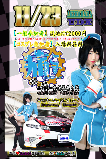 エントリー始まったので宣伝ですー。 普段は秋葉原を主戦場として、 撮影会をしておりますが コスプレと痛車を合せてカーショーの ようなレースクイーン風撮影がやってみたい ということで企画した第二弾! ※今回募集仕様は艦これメインですが他仕様車でも大丈夫です! コスプレイヤーと痛車両方のエントリー状況 は公式ツイッターにて随時更新していきます https://twitter.com/itacos_motoriz 【エントリー受付中】ホームページ問い合わせより ホームページ&問い合わせ、申し込みは↓までお願いします xxcross.com/support.htm