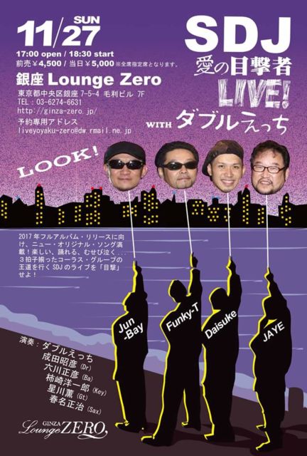 SDJ¡Ö°¦¤ÎÌÜ·â¼Ô¡×¥é¥¤¥Ö with ¥À¥Ö¥ë¤¨¤Ã¤Á at ¶äºÂLounge ZERO 2016ǯ11·î27Æü(Æü) ¾ì½ê¡§¶äºÂ¥é¥¦¥ó¥¸£Ú£Å£Ò£Ï http://ginza-zero.jp/ ÅìµþÅÔÃæ±û¶è¶äºÂ£·ÃúÌÜ£µÈÖ£´¹æ TEL:03-6274-6631 OPEN¡§17:00 / START¡§18:30 2¥¹¥Æ¡¼¥¸¡¦ÆþÂØ¤Ê¤· ½Ð±é¡§SDJ JAYE¸ø»³¡¦ Funky-T¡¦Jun-Bay¡¦ Daisuke ±éÁÕ¡§¥À¥Ö¥ë¤¨¤Ã¤Á À®Åľ¼É§(Dr)¡¦Ï»ÀîÀµÉ§(Bass) ³ÁºêÍΰìϺ(Key) ¡¦À±Àî·°(Guit)¡¦½Õ̾Àµ¼£(Sax) ÎÁ¶â¡§Á°Çä¡ï4,500 / ÅöÆü¡ï5,000 ¢¨Á´ÀÊ»ØÄêÀʤȤʤê¤Þ¤¹¡£ ¡ý¾°¡¢¤´Í½Ìó¤¬Äê°÷¤Ë㤷¤¿¾ì¹ç¤Ïͽ¹ð¤Ê