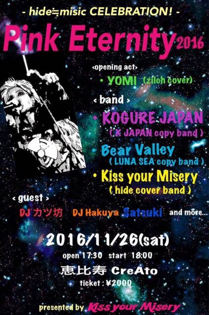 -hide¢âmusic CELEBRATION!- PINK ETERNITY 2016 ¡ù³«ºÅ·èÄê¡ù hide¤Î²»³Ú¤ò±Ê±ó¤Ë»Ä¤·¤Æ¤¤¤¤¿¤¤¡ª¡ª À¸¤Ç´¶¤¸¤¿¤¤¡ª¡ª³Ú¤·¤ß¤¿¤¤¡ª¡ªÍ·¤Ó¤¿¤¤¡ª¡ª hide¥Õ¥¡¥ó¤Ë¤è¤ë hide¥Õ¥¡¥ó¤Î¤¿¤á¤Î hide¥Õ¥¡¥ó¤ÇÁϤê¾å¤²¤ë ÅÁÀâ¤ÎLIVE¥¤¥Ù¥ó¥È ¤ª¤â¤Á¤ãÈ¢¤Ò¤Ã¤¯¤ê¤«¤¨¤·¤¿¤è¤¦¤Ê¡¢ ¥µ¥¤¥¨¥ó¥¹¤Ê¶õ´Ö¤ò ¥¥ß¤âÂ賤·¤Á¤ã¤ª¤¦¡ª¡ª -hide¢âmusic CELEBRATION!- PINK ETERNITY 2016 2016/11/26(Sat) Open 17:30 Start 18:00 Close 21:00 ·ÃÈæ¼÷CreAto (¢©150-0011 ÅìµþÅÔ½Âë¶èÅì3ÃúÌÜ14-19 ¥ª¡¼¥¯¥Ò¥ë