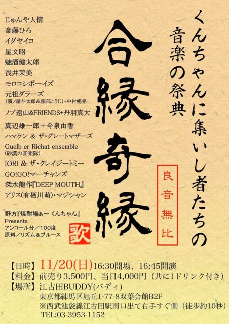 ÌîÊý¤Î¾®¤µ¤Ê¾ÆÃñ²°¡Ø¾ÆÃñ¾ì¤¡¡Á ¤¯¤ó¤Á¤ã¤ó¡Ù¤Ç¤Ï¡¢½µËö¤Ê¤É¤Ë¥é¥¤¥Ö¤ò¥¹¥¿¡¼¥È¤µ¤»¤ÆÁá10ǯ¡¼¡£ ¤´½Ð±é夤¤¿¥ß¥å¡¼¥¸¥·¥ã¥ó¤ò¤Ï¤¸¤á¤È¤¹¤ë±é¼Ô¤Î³§Íͤοô¤â·Ú¤¯100̾¤òͤ¨¤Æ¤·¤Þ¤¤¤Þ¤·¤¿¡£ ¿ôǯÁ°¡¢¥é¥¤¥Ö¤Ç¤â¤ªÀ¤ÏäˤʤäƤ¤¤ë¿¼¿åζºî¤µ¤ó¤Î¡Ö¤¯¤ó¤Á¤ã¤ó¤Ë½¸¤Þ¤Ã¤Æ¤ë¥ß¥å¡¼¥¸¥·¥ã¥ó¤¿¤Á¤ò½¸¤á¤¿¥¤¥Ù¥ó¥È¤ò¤ä¤ì¤ÐÌÌÇò¤¤¤ó¤¸¤ã¤Ê¤¤¡©¡×¤È¤¤¤¦°ì¸À¤«¤é»Ï¤Þ¤Ã¤¿¤³¤Î´ë²è¡¢ÉÔÀº¤Ê¥ª¥¤¥é¤Ç¤¹¤¬¤ä¤Ã¤È½Å¤¤¹ø¤ò¾å¤²¤Æ¼Â¸½¤·¤Þ¤¹¡ª º£²ó¤Ï¡¢²»³Ú¤òÃæ¿´¤Ë16ÁȤθÄÀˤ«¤Ê¥¢¡¼¥Æ¥£¥¹¥È¤¿¤Á¤¬Â罸¹ç¡ª ¤³¤Î¥¤¥Ù¥ó¥È¤ò´Ñ¤ì¤Ð¡¢¤¯¤ó¤Á¤ã¤ó¤Ë¤´½Ð±éĺ