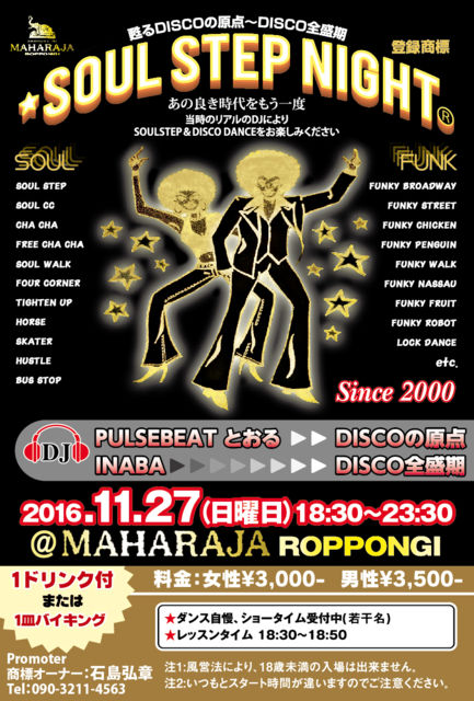 ¡úSOUL STEP NIGHT(ÅÐÏ¿¾¦É¸) Åö»þÍÙ¤ê¤òµá¤á¤Æ¤¤¤¿»þÂå¤Ï¥Õ¥ê¡¼¥À¥ó¥¹¤âSTEP¤â¤«¤Ã¤³¤è¤«¤Ã¤¿¡£ DISCO¸¶ÅÀ»þÂå¡ÁDISCOÁ´À¹´ü¤Î Åö»þ¤Î¤¢¤ÎÎɤ»þÂå¤ò¡¢Åö»þ¤ÎDJ¤Ë¤è¤ê¤ª³Ú¤·¤ß¤¯¤À¤µ¤¤¡£ ¢öDISCO¸¶ÅÀ»þÂå¤Ï¡¢Ä¾ÌÚ¾Þºî²È¤ÎÀõÅļ¡ÏºÃø[²âĮʪ¸ì]¤ËDJ¤ÎPULSEBEAT¤È¤ª¤ë¡áÀÐÅĵü¤¬²òÀâ¤Ç½Ð¤Æ¤ª¤ê¤Þ¤¹¡ª ¢öDISCOÁ´À¹´ü»þÂå¤ÏÅö»þÏ»ËÜÌÚ¥¹¥¯¥¨¥¢¥Ó¥ë¤Î¥Í¥Ú¥ó¥¿¤ÎDJ°ðÍջ᤬ôÅö¤·¤Þ¤¹¡£ ½é»²²Ã¤Î¤ªµÒÍͤâ¥ì¥Ã¥¹¥ó¥¿¥¤¥à¤â¤¢¤ê¤Þ¤¹¤Î¤Ç¤´°Â¿´¤¯¤À¤µ¤¤¡£ [Æü»þ] 11/27(Æü)18:30¡Á23:30 »þ´Ö¤Ï18:30¤«¤é¤Ç¤¹¤Î¤Ç¡¢¤ª´Ö°ã¤¤¤Ê¤¤¤è¤¦µ¹¤·¤¯¤ª´ê