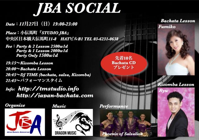 NPO法人日本バチャータ協会のソーシャルパーティーが膈月第4日曜日に開催します。毎回、日本バチャータ協会理事のバチャータレッスンとRyuのキゾンバレッスンがあり、選曲はバチャータを中心にサルサやキゾンバ、オールアフロラテンを楽しめるイベントです。華やかなパフォーマンスも楽しめます!皆さんJBAで会いましょう!